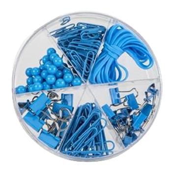 Your office essentials kit! Kit includes: 14pcs 15MM binder clips, 60pcs ball push pins, 9pcs 19MM binder clips, 80pcs 28MM paper clips, 27pcs 50MM paperclips, 15G rubber bands.